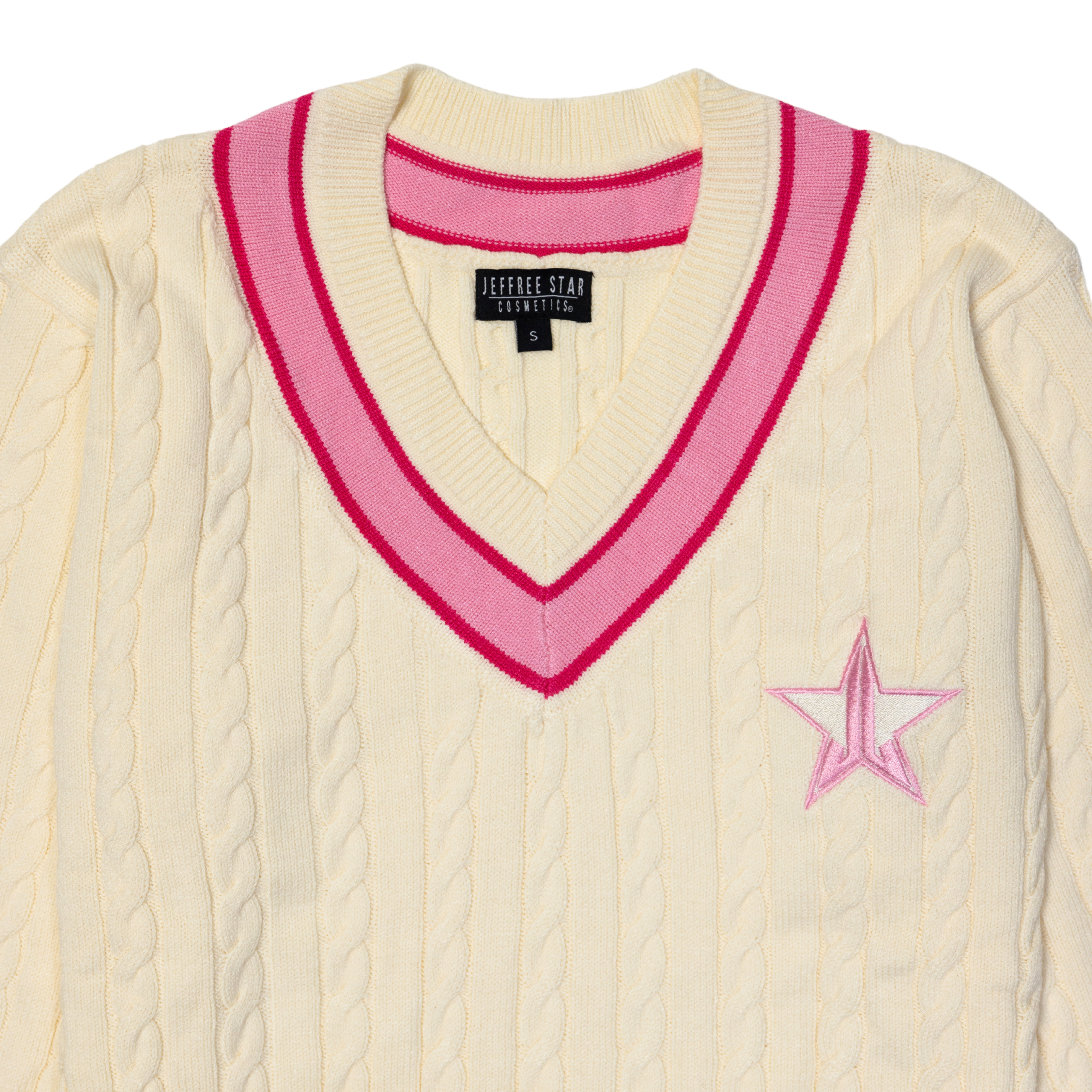 Designed with pink collegiate stripes. our Varsity Sweater in ‘Cream’ is the perfect go-to uniform for your back to school era. Not in school? No problem! This sweater is also great for casual outings. walking your dog or a day at the office.?