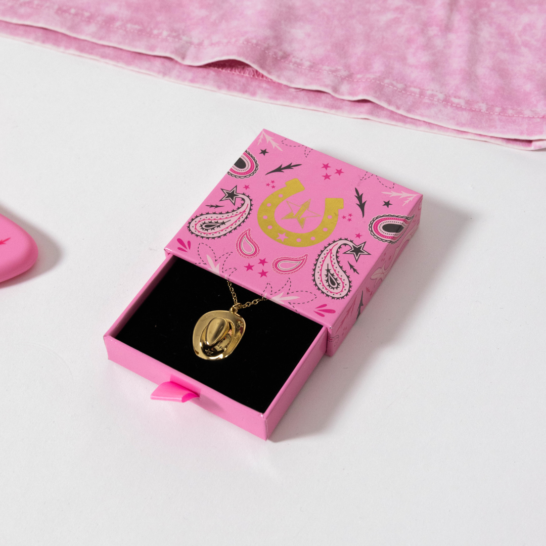 Our Engraved Cowgirl Hat Necklace is a staple to complete your look! The adjustable chain ensures a perfect fit. allowing you to customize the necklace’s length to suit any neckline or style preference. Engraved with Jeffree Star’s autograph and packaged in a beautifully designed box making it the perfect gift (for yourself) of someone else!?
